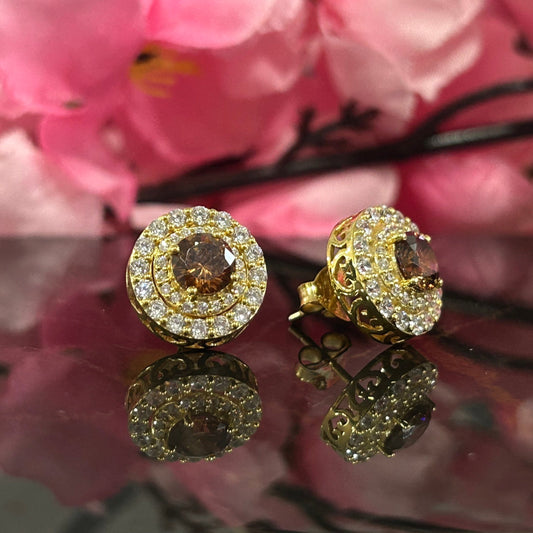 SCARLET Natural Champagne Diamond Double Halo Stud Earrings in 14K Yellow Gold Vermeil