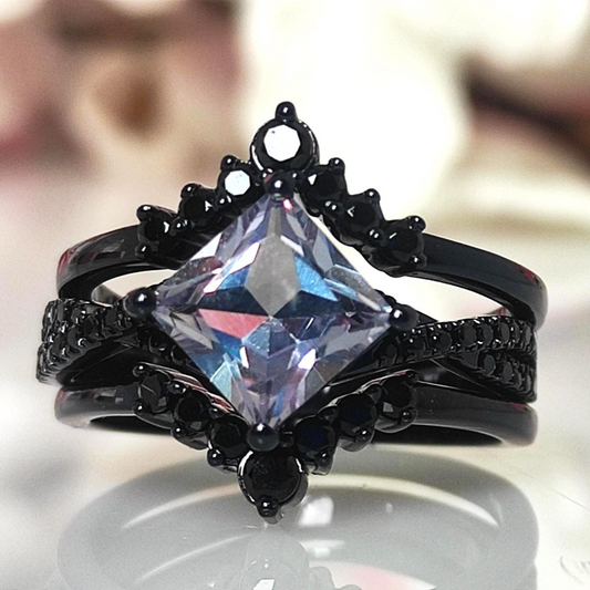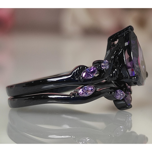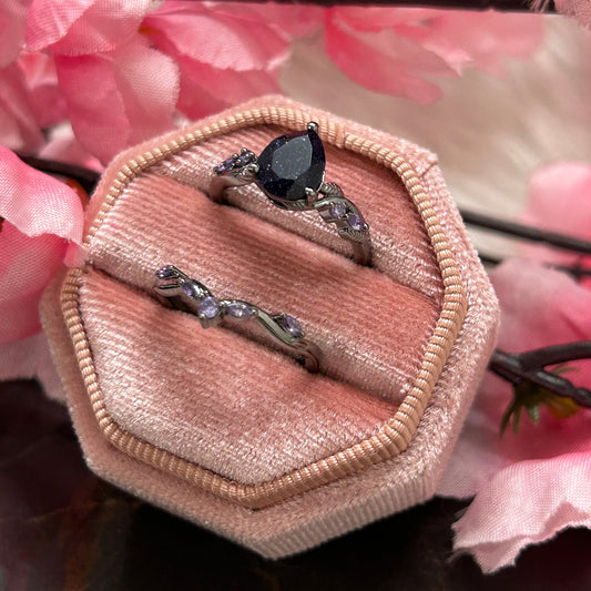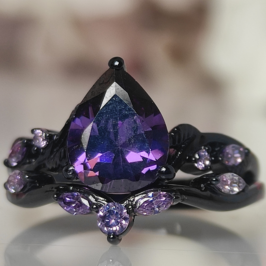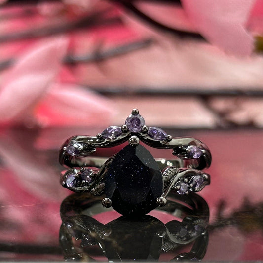 Pear & Round Cut Black Rutile Diamond Wedding Ring- Engagement Ring- 14K Black Gold Finish