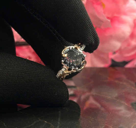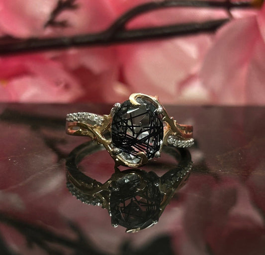 Oval Cut Black Rutile Quartz Engagement Ring 14K Two Tone Gold Vermeil