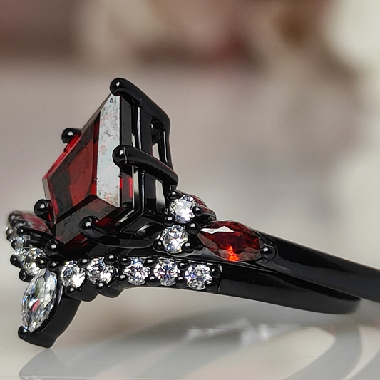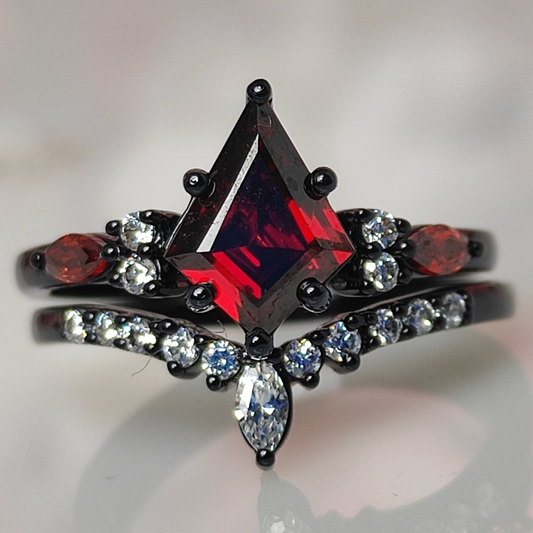 Unique Kite Cut Red Garnet Engagement Ring Set - V Shape Wedding Ring in 14K Black Gold Vermeil