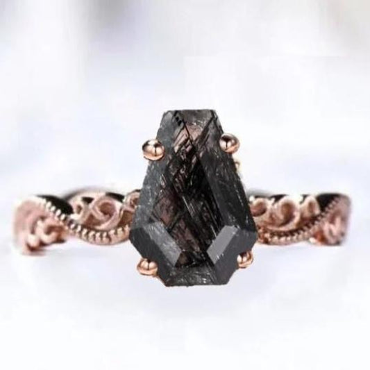 Coffin Cut Black Rutile Diamond Engagement Ring- Vintage Ring- 14K Rose Gold Finish