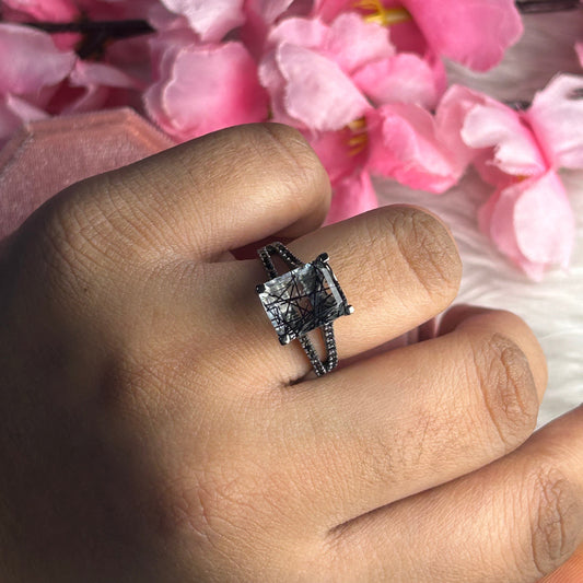 RAVEN Radiant Cut Black Rutile Quartz Engagement Ring- Black Diamond Wedding Band in 14K Black Gold Vermeil