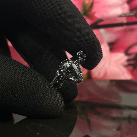 RAVEN Pear Cut Black Rutile Quartz and Black Diamond Wedding Ring- Gothic Engagement Ring For Women
