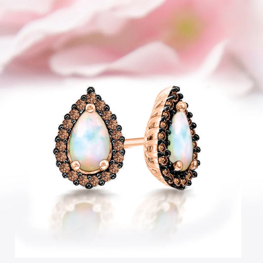 ECLIPSE Pear Shaped Fire Opal and Halo Brown Diamond Stud Earring in 925 Sterling Silver