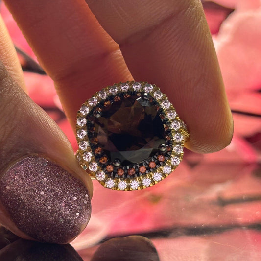 AURA Cushion Cut Natural Smoky Brown Diamond Double Halo Engagement Ring For Women