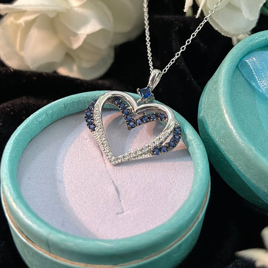 Romantic Heart Blue Sapphire and White Diamond Pendant Necklace With 18" Chain in 925 Sterling Silver