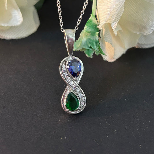 Blue Sapphire and Green Emerald Infinity Pendant Necklace- Love Knot Pendant with 18" Chain Birthstone Pendant