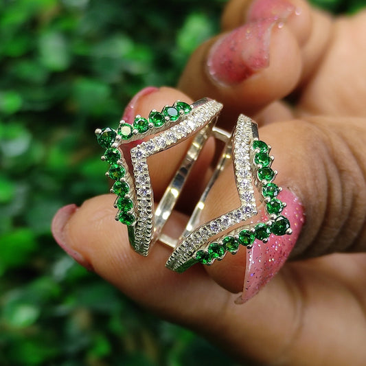 VIVID Round Cut Emerald & White Diamond Wedding Engagement Ring Guard Wrap in 925 Sterling Silver