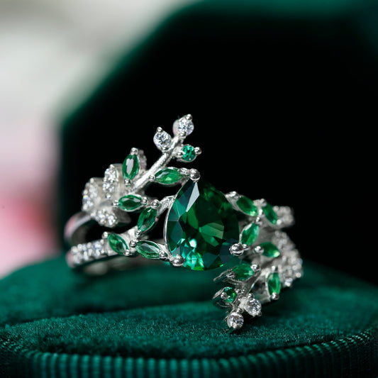 IVY Pear Cut Green Emerald Leaf Wedding Engagement Ring For her in 925 Sterling Silver
