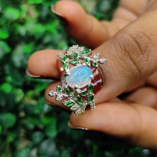 AURA Fire Opal and Emerald Vintage Leaf Wedding Ring 925 Sterling Silver Engagement Ring Gift for Her