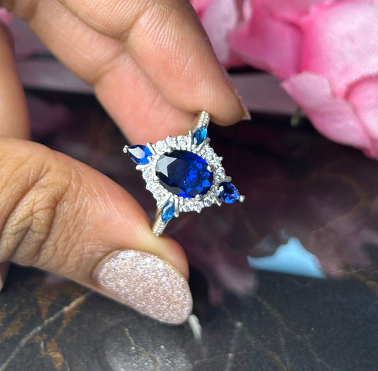 ROYAL Blue and White Sapphire Wedding Ring- Halo Diamond Engagement Ring 925 Sterling Silver