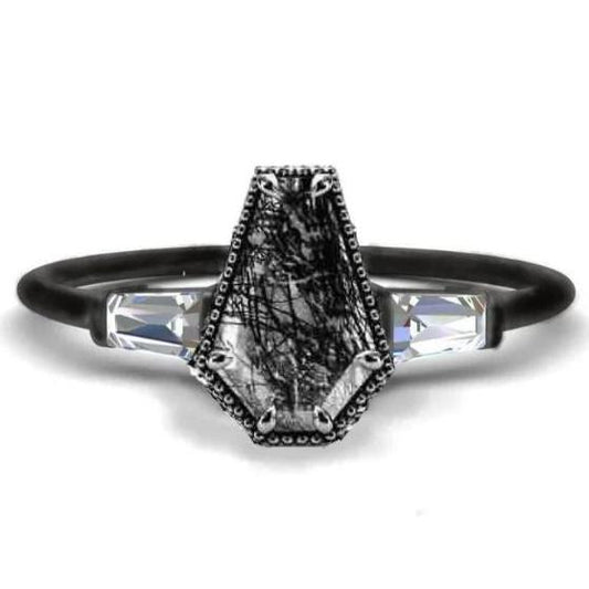 Shield Cut Black Rutiled Quartz Ring- Baguette Band Wedding Bridal Engagement Ring- 14K Black Gold Vermeil