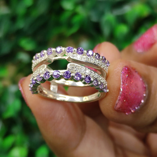0.55Ct Purple Amethyst and White Diamond Cathedral Solitaire Enhancer Wedding Ring Guard