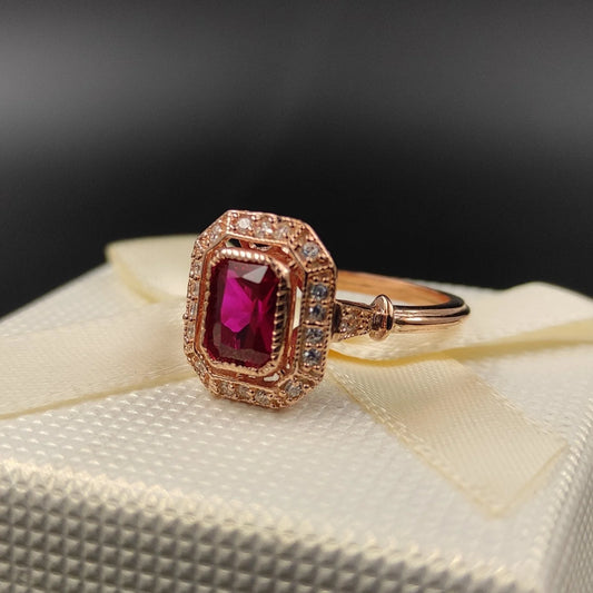 Antique Emerald Cut Ruby & White Diamond Ring in 14K Rose Gold Vermeil- Wedding Ring For Wife