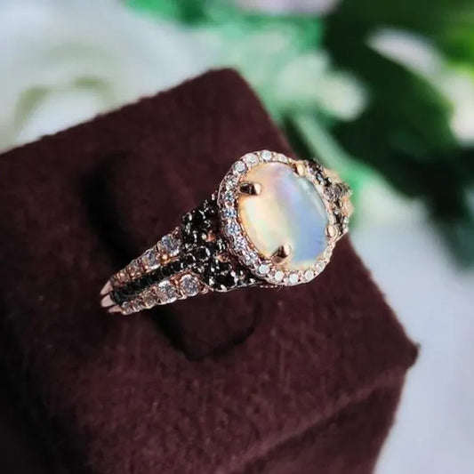 Oval Cut Rainbow Moonstone & Brown Diamond Engagement Ring- 14K Rose Gold Vermeil