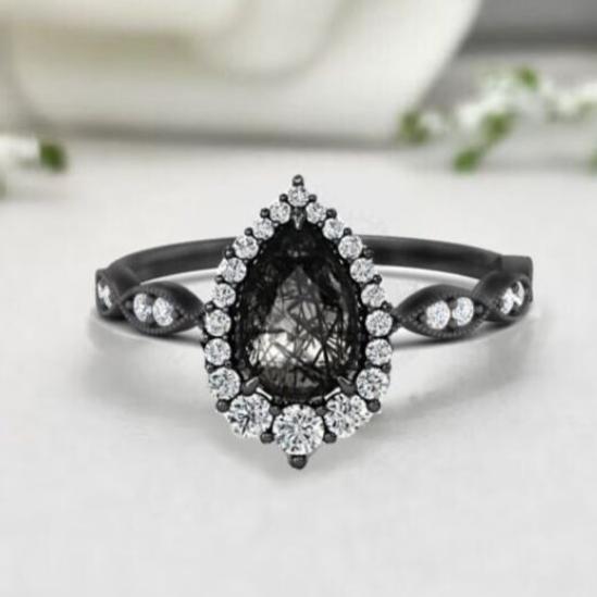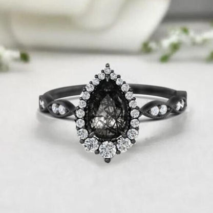 Pear & Round Cut Black Rutile Diamond Wedding Ring- Engagement Ring- 14K Black Gold Finish- Vintage Ring For Women- Bridal Ring- Anniversary Gifts For Her- Gifts For Wife
